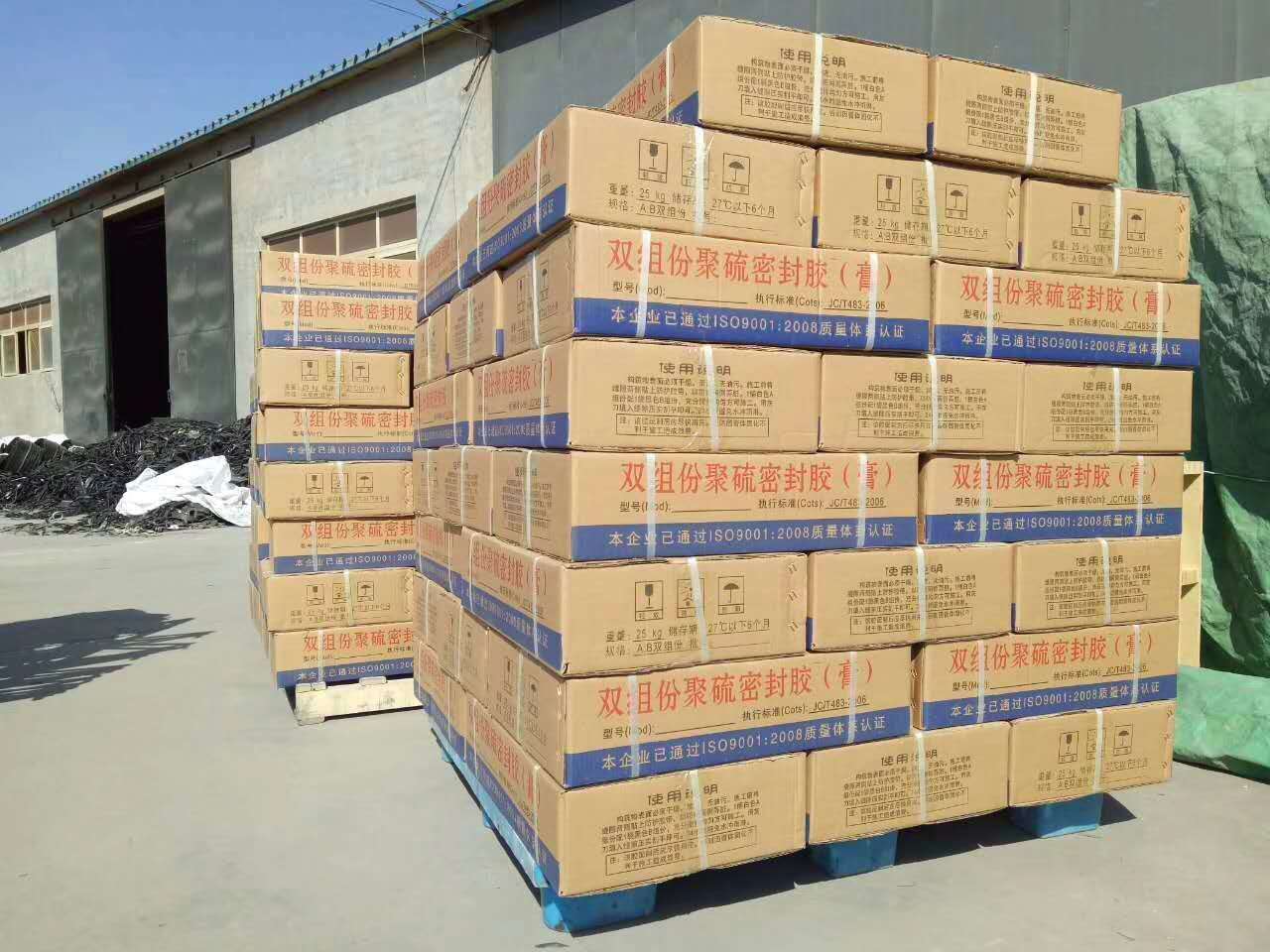 聚硫密封膏箱內(nèi)有一桶白聚硫膠和一桶黑固化劑充分?jǐn)嚢杈鶆蛑钡綗o(wú)色差為止。將雙組份聚硫密封的AB膠同時(shí)倒